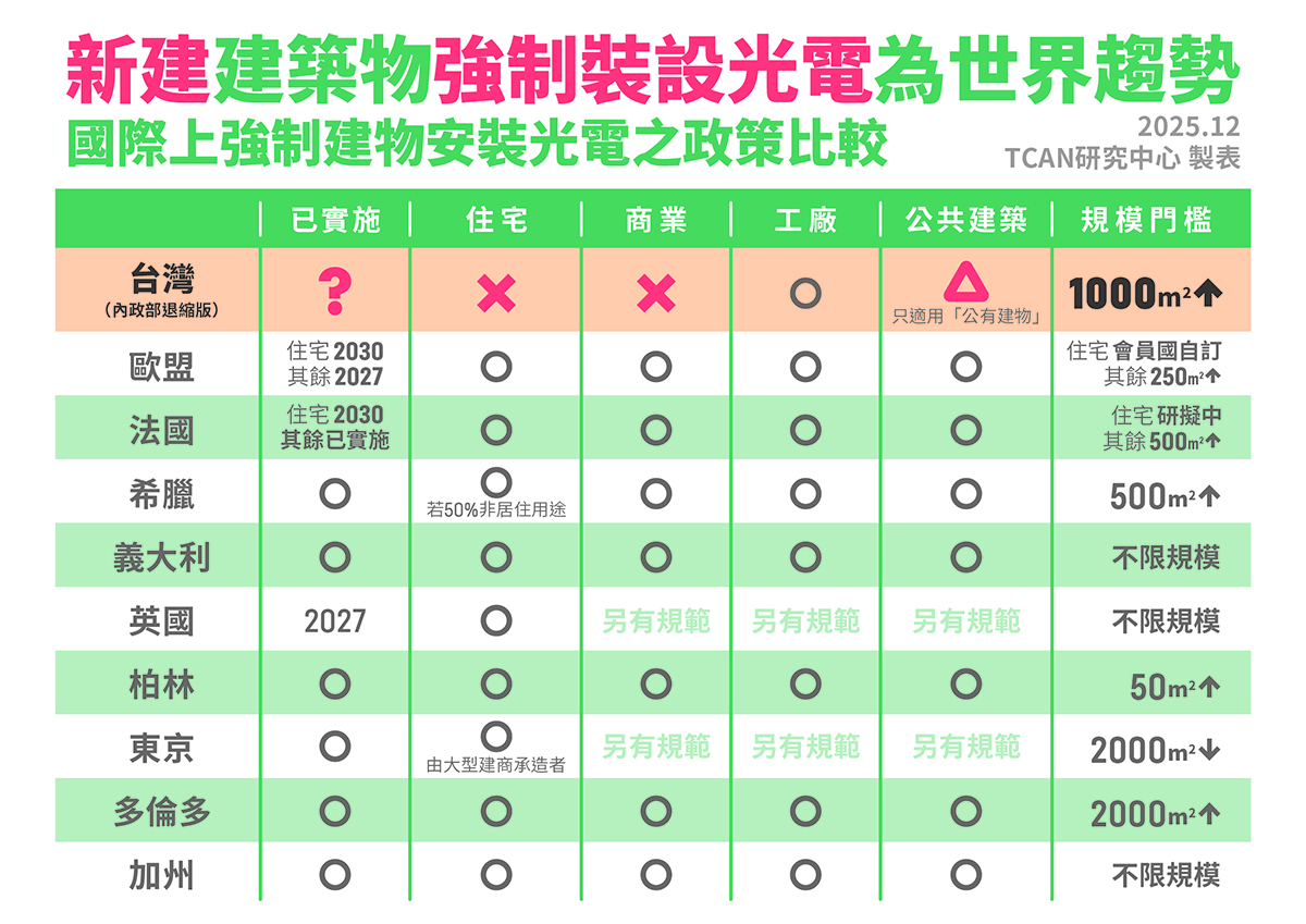 環團整理國際上安裝光電的政策比較,顯示台灣對多數建物未有明確規範且上路遙遙無期。(圖片來源/地球公民協會)