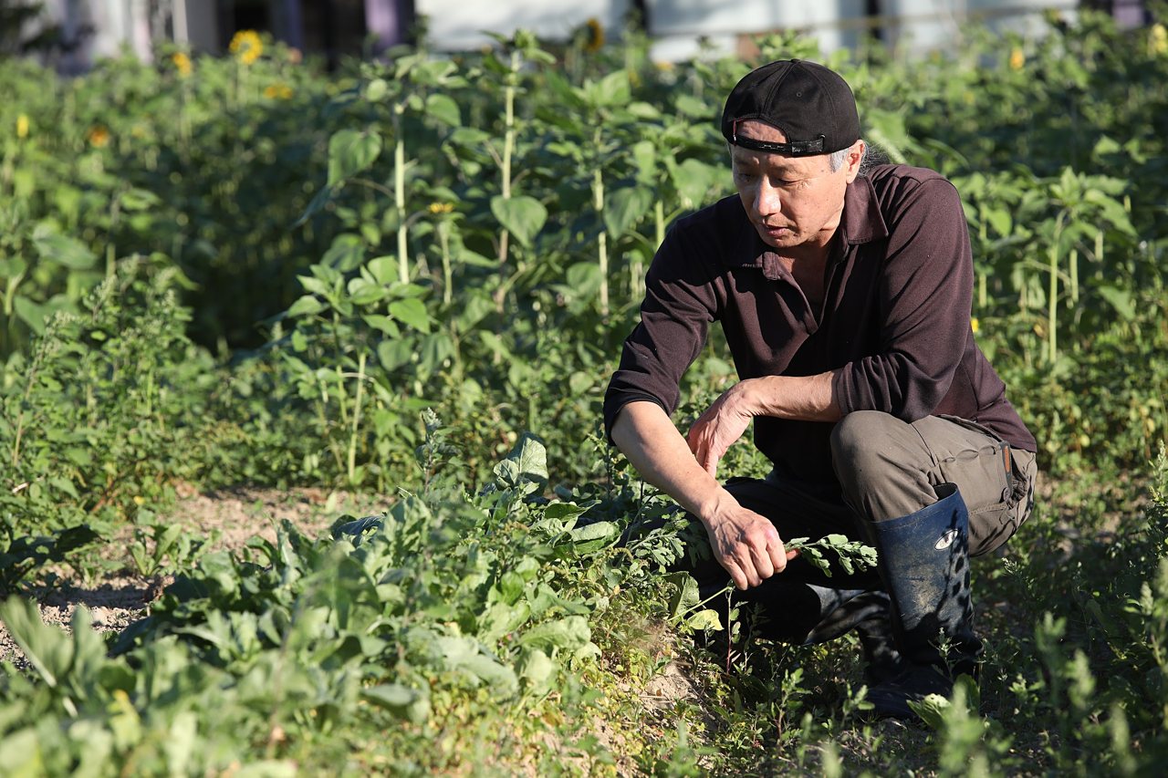 黃盟生站上舞台很搖滾,在農田裡是善待生態的溫柔大叔,他得意地說,「我的農產品不嗑藥」,田區是取得林保署綠保認證與「草鴞標章」的友善有機田區,田裡設有棲架,歡迎草鴞來田裡歇歇腳。現在正是冬季裡作,他撒下大片白玉蘿蔔種子,為社區種下「公益田」,讓民眾來「公益拔蘿蔔」。