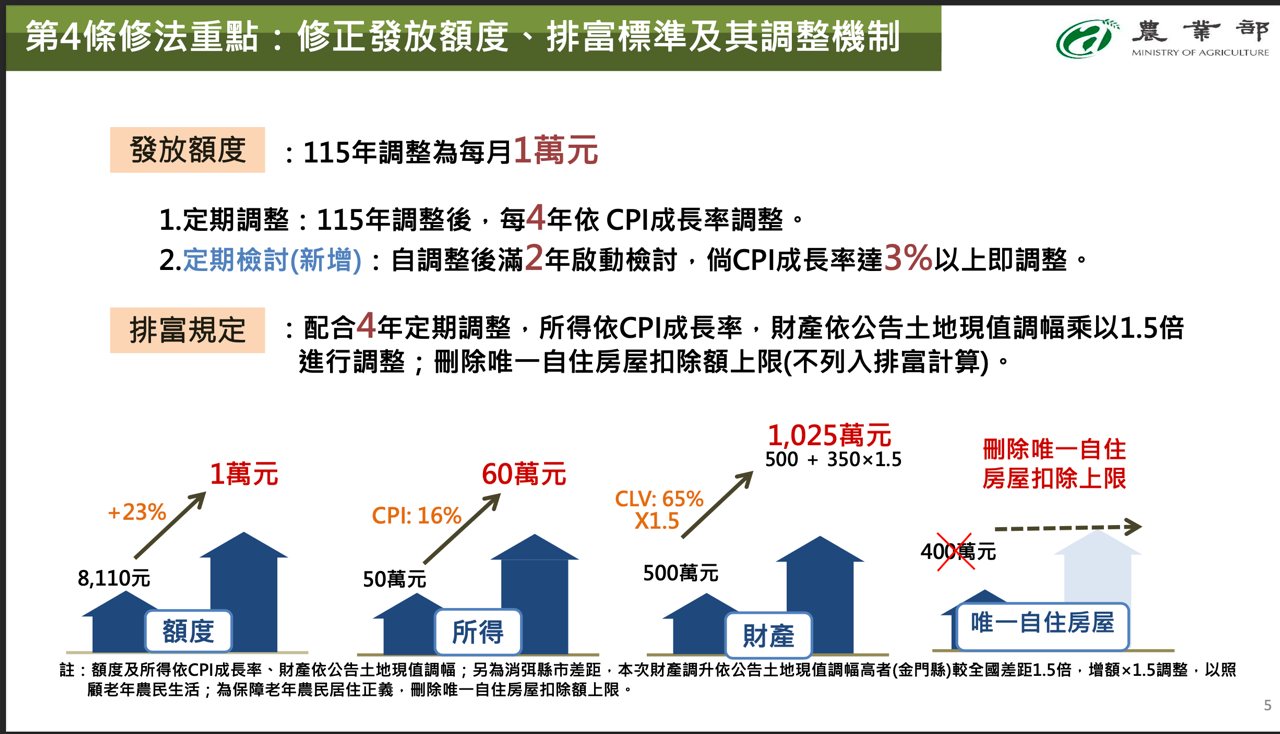 排富標準也建立4年調整機制,所得調高至 60 萬元,土地及房屋價值額度則調升到 1025 萬元,並刪除唯一自住房屋扣除額上限,不列入排富計算。預計約有 53 萬老農受惠。