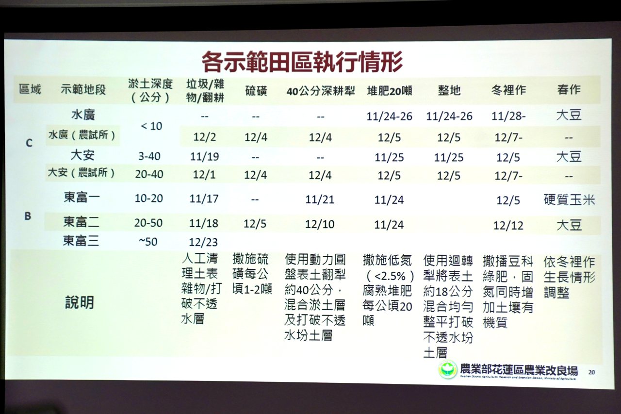 針對受災農民反應,農糧署東區分署表示,示範田還在試驗階段,針對不同淤積程度要怎麼處理、要種什麼、需要多少設備進場、滴灌是否合適等細節,花改場和農試所還未給出最終定案。假若未來農民想按照示範田的方法來復耕,該如何進行?目前尚未擬定完整的協助方案。預計在 2 月會辦一場說明會,說明完整試驗結果。
