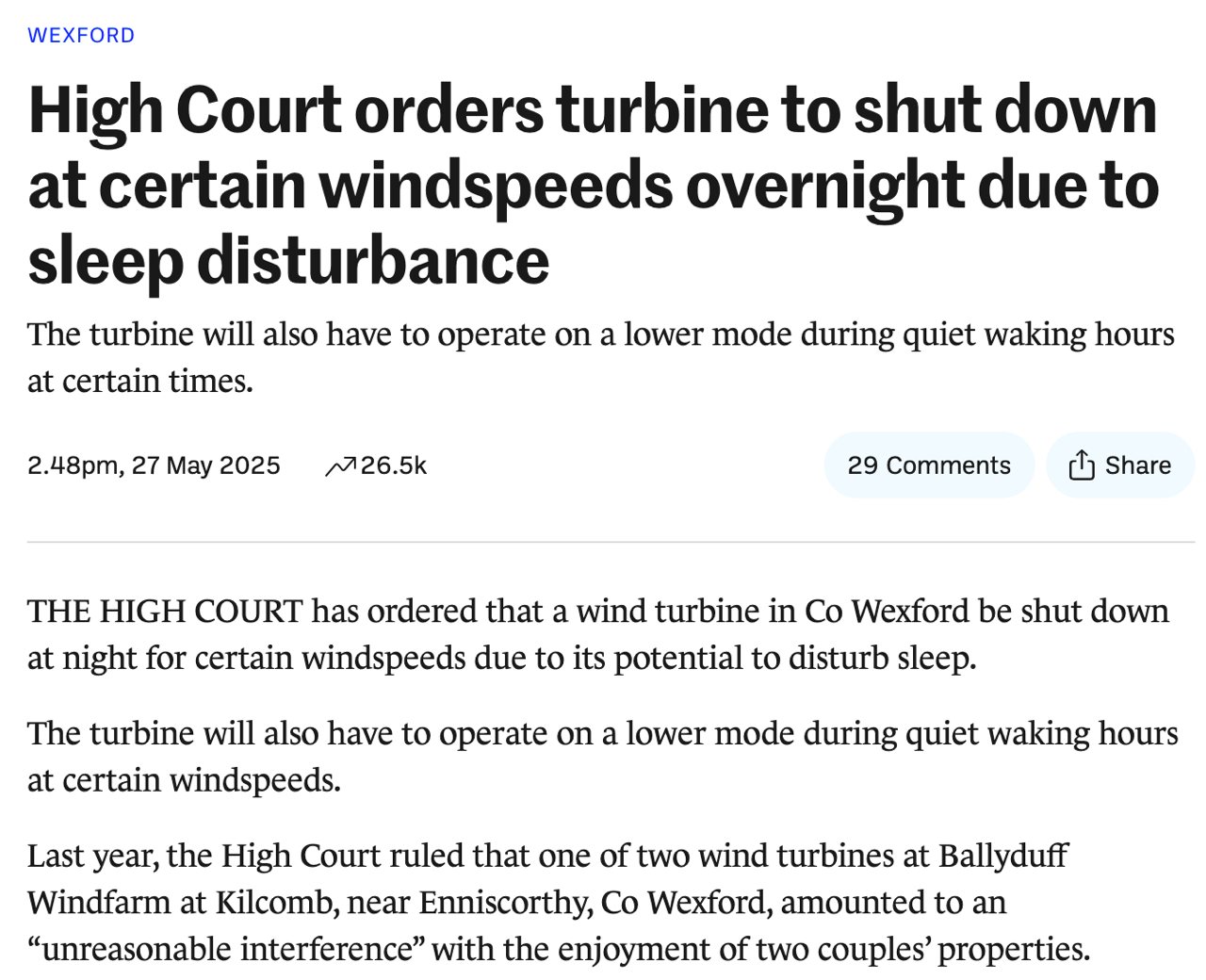 此案是當地首例,被視為是風電開發與居民權益衝突的重要指標,愛爾蘭法院強調支持再生能源,但居民也有權維護居住安寧。