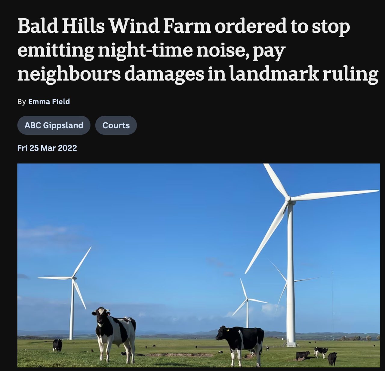 法官指出,營運方未遵守噪音許可條件,噪音嚴重干擾居民夜間睡眠,構成妨害安寧。最終裁定風場若不改善噪音,未來不得在夜間運作。法院同時判賠兩位居民共 26 萬澳幣(約新台幣 550 萬元),其中一人獲得「精神痛苦與困擾」賠償,另追加加重賠償,理由是風場方對投訴態度高傲,處理消極。