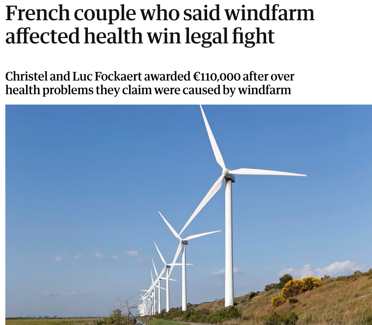根據《衛報》,法國圖盧茲法院於 2021 年首度認可「風機症候群」,裁定風力發電場需賠償居民健康損害。居住在塔恩省豐特里厄的福卡特夫妻投訴,距家僅 700 公尺的 6 座風機長期造成他們頭痛、失眠、心律不整、憂鬱等症狀,並指出風機噪音宛如洗衣機不斷轉動,夜間白色閃光更讓人難以入睡。夫妻搬家後健康恢復,法院鑑定專家也援引科學研究,支持「風機症候群」確實存在。