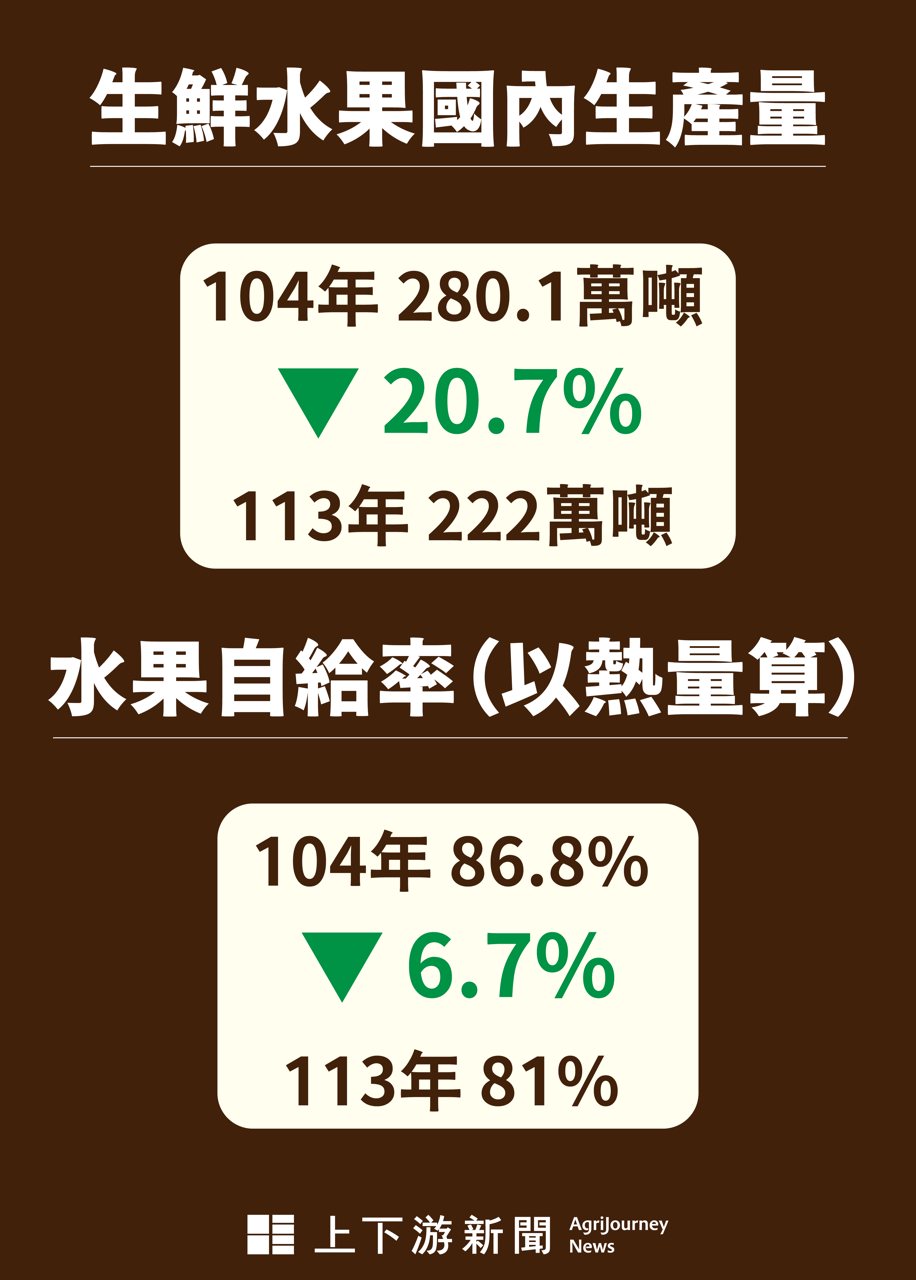 根據農業部 113 年糧食供需年報,台灣水果國內生產量十年降幅2成,由2015 年 280 萬噸,下降至 2024 年的 222 萬噸,自給率也從 88.3% 下滑至 81.9%,為近 10 年低點。