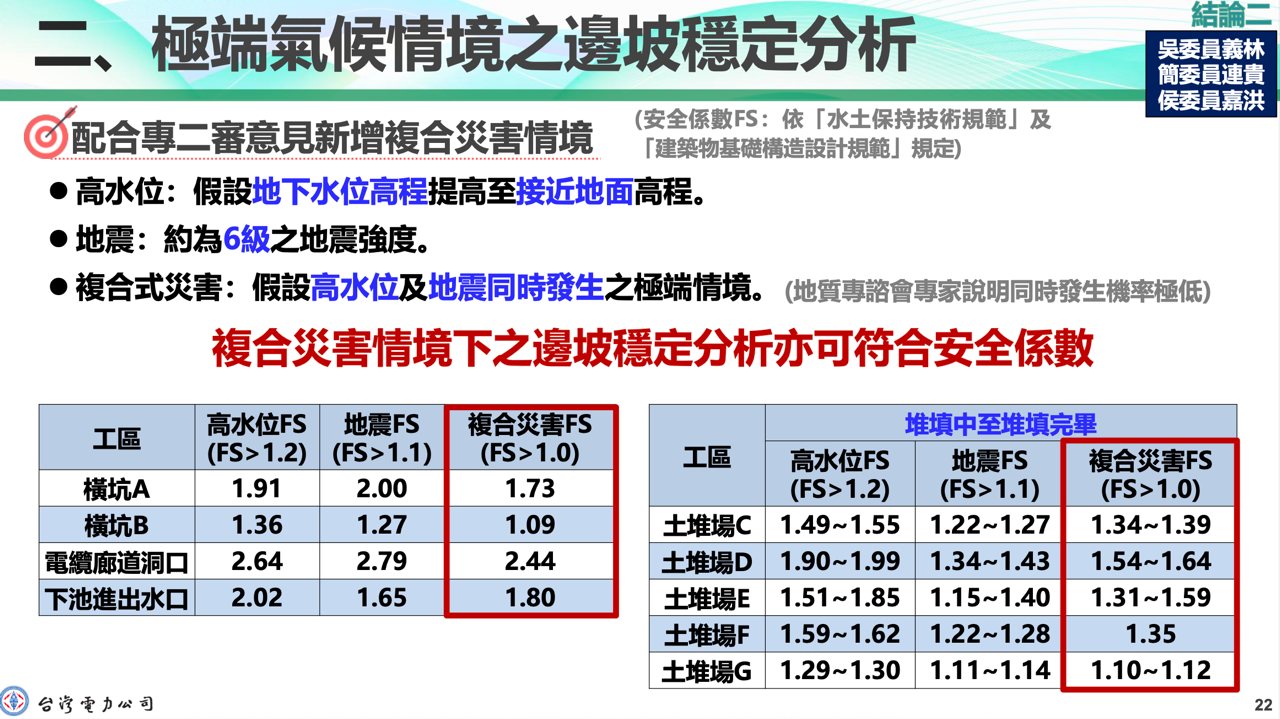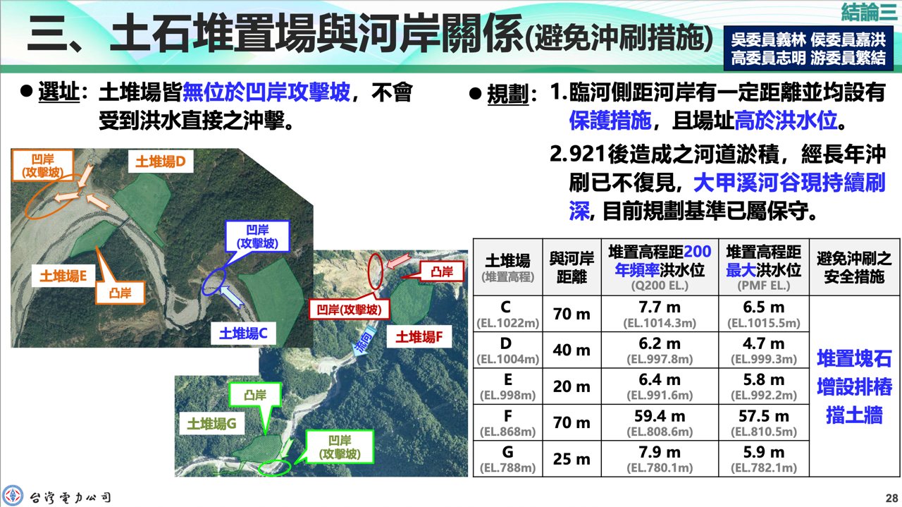 委員吳義林表示,近年多有累積降雨量超過 2000 公釐的情形,山坡已是飽水位,任何地震一來,都會產生嚴重影響。即使開發單位有計算 200 年頻率洪水位(意即 200 年一遇洪水等級),但5 處土堆場的堆置高程離洪水位不到 10 公尺的就有 4 個,如果再計算河流沖刷效應,只要經過 2 至 3 次的沖刷,至少有 2個以上的土堆場無法撐過 50 年,他認為,「評估都不夠極端」。