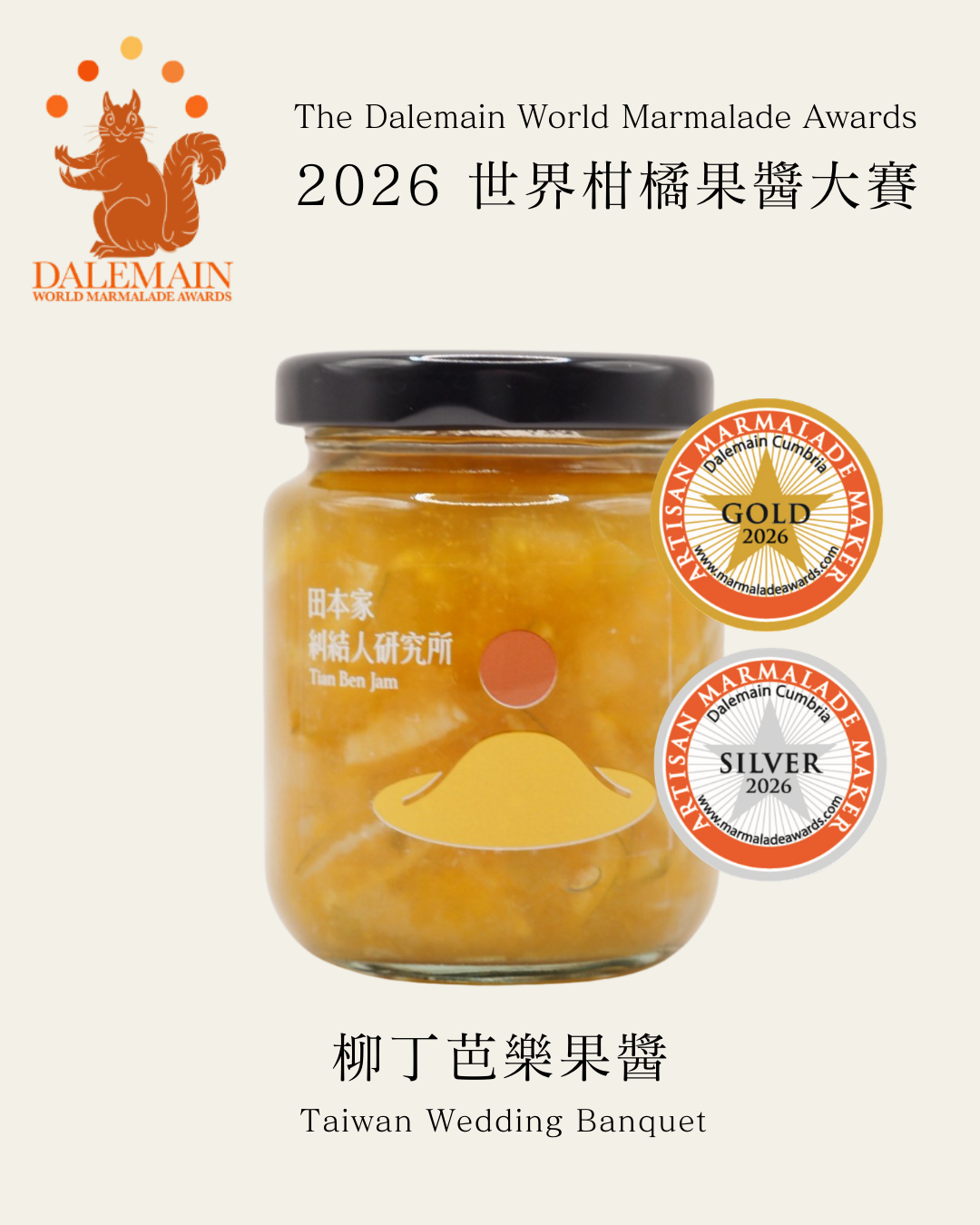 英國柑橘果醬大賽,已成台灣果醬創作最佳舞台,職人們以台灣多元柑橘融合其它農產,連年獲獎。2026年台灣職人再傳捷報,過往拿下三冠王的果食男子榮獲 2 金 14 銀 7 銅 2 佳作,「小甜心」榮獲 2 金 14 銀 6 銅,玫開四度則拿下 1 金 8 銀 16 銅佳績,田本家則是二度參賽就拿下 1 金 2 銀 3 銅 2 佳作,青菓邸舍獲得 1 銀 6 銅,成功發揮台灣在地食材的可塑性,表現出源源不絕的創新能量。