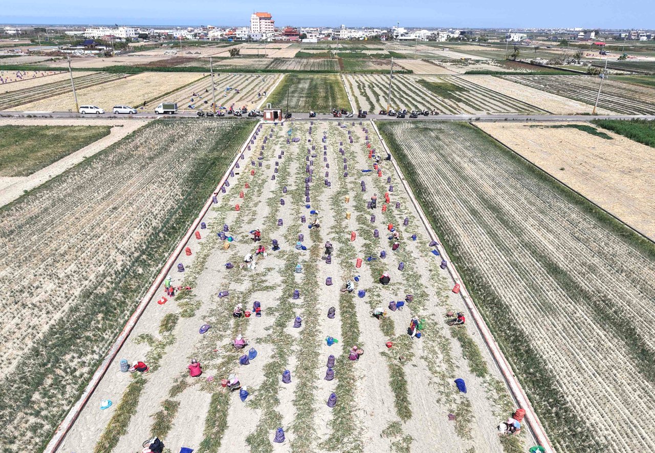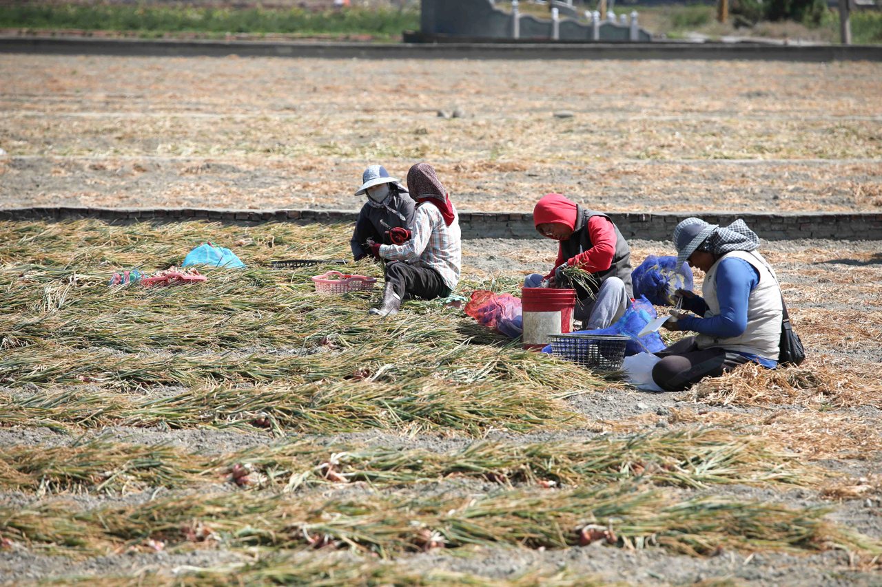 走進田區,滿是經過機械翻土後,再由人工排列作日光浴的珠蔥。大約曬過一天後,經人工剪去蔥葉、蔥根,只留下紅蔥頭。每一塊收成中的田區可見到少則 20 餘人、多則 30、40 名採收工,剪完之後的紅蔥頭集中裝入袋內,再於農田裡排列整齊。