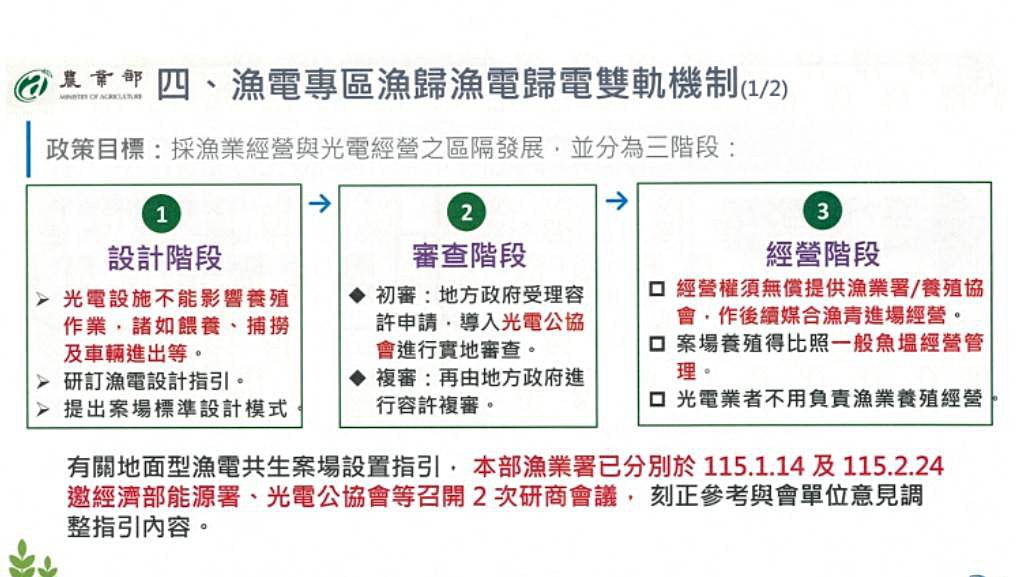她指出,「漁電共生」之所以可容許光電板設置於魚塭,必須符合《申請農業用地作農業設施容許使用審查辦法》第 27 條「結合農業經營」原則,通過審查認定具有農(漁)業經營事實,才能取得容許;第29條也在確保農業經營須與綠能設施結合。若新制導向「漁歸漁、電歸電」,光電設置的合理性將難以回應外界質疑。