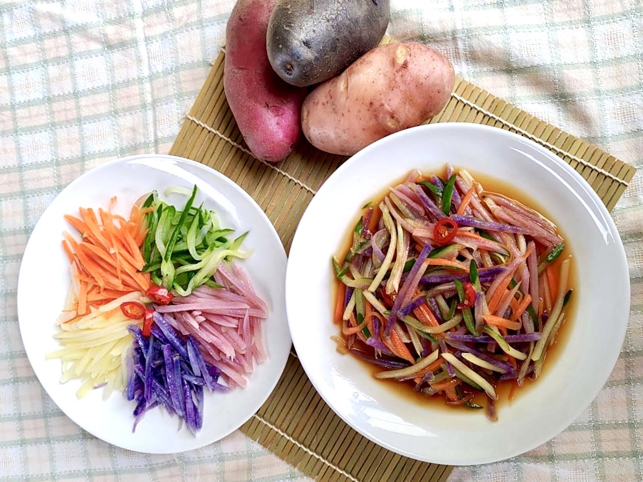 彩色馬鈴薯若用水煮顏色容易流失,張燕容建議以蒸、烤或油炸的方式烹調,最能鎖住其漂亮的色澤與營養。斗南農會也發揮巧思,將其做成醋溜涼拌、彩色湯圓,甚至是包入紅豆或芋頭泥做成三色糰子「彩色薯薯雪球串」,香氣有別於一般馬鈴薯,更令人驚豔。