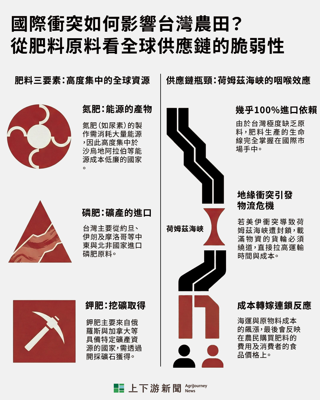 因為原料幾乎 100% 仰賴進口,一旦國際爆發衝突,像這次美伊戰爭,扼守波斯灣咽喉的「荷姆茲海峽」若遭到封鎖或管制,滿載能源與礦產的貨船被迫繞道,飆漲的海運與原物料成本,最終就會轉嫁到農民及消費者身上。台灣農田的命運,就這樣和國際局勢緊緊地綁在一起了。