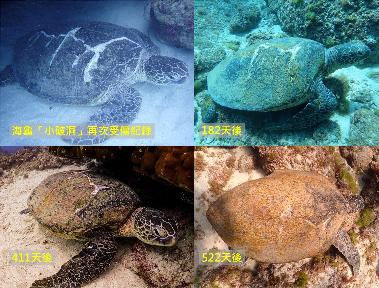 然而,在復原期間,有約 10.5% 的個體曾出現重複受傷的情況,比如海龜「小破洞」曾兩度遭擊傷,一次背甲破裂,時隔一年又遭螺旋槳擊傷,每次都花費 500 至 600 多天獨自復原,很多人都曾經目擊牠,回報照片都是傷痕累累,但仍然很努力想活下來。
