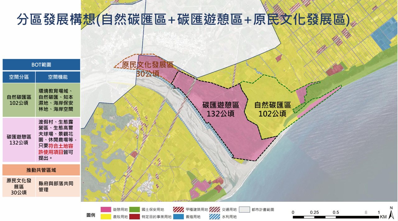 2025 年,台東縣府在這塊公有地重啟開發,以 BOT 模式委託規劃公司推動「碳匯開發」。所謂碳匯,是透過設置平地森林產生固碳效果,再將碳權投入市場交易以獲利。規劃公司預計將土地分為三區:一區提供部落使用以取得部落同意;中間大面積休憩用地設置高爾夫球場並植樹作為「碳匯」;濕地水域則保留作為「自然碳匯」。
