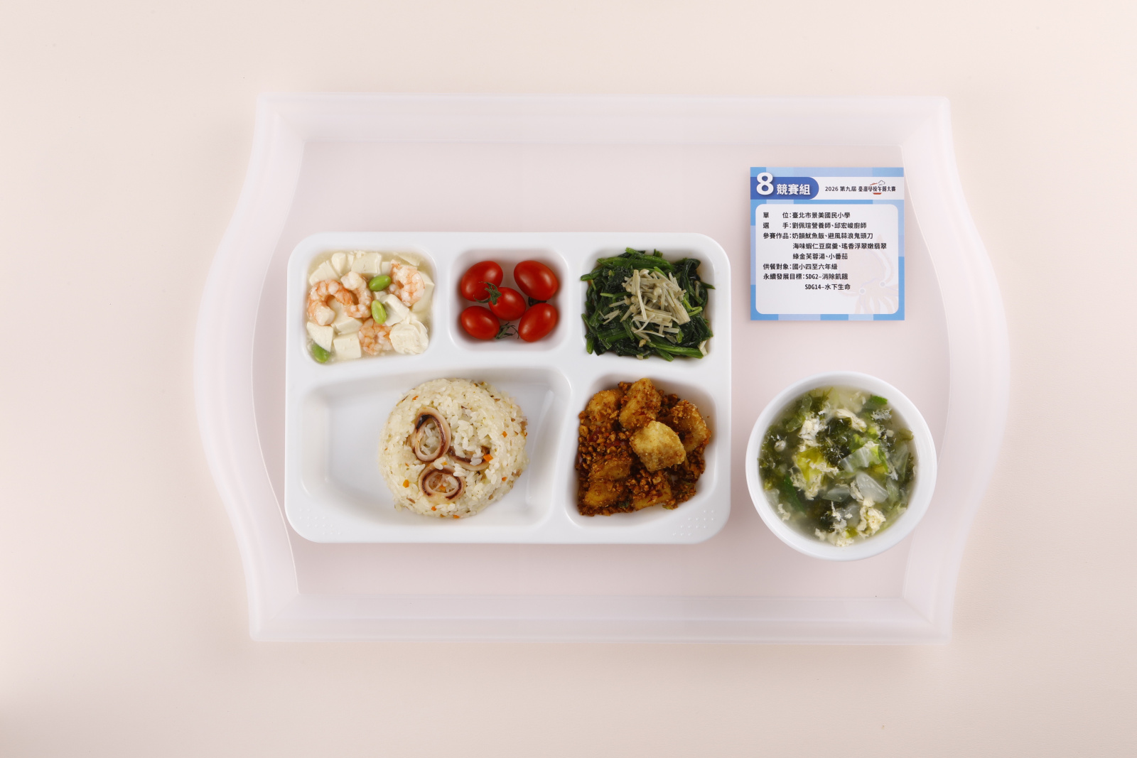 本屆共有來自全國9縣市的12支校園午餐團隊晉級決賽,最終由臺北市景美國民小學獲得冠軍、永續食魚獎、食育教學卓越獎、國小學生評審獎等四大獎,劉佩瑄營養師與邱宏峻廚師端出「奶韻魷魚飯、避風蒜浪鬼頭刀、海味蝦仁豆腐羹、瑤香浮翠嫩翡翠、綠金芙蓉湯、小番茄」作品,以兼具技術、教育理念和國產水產精神的整體實踐,深具示範性與推展價值,獲評審青睞。冠軍隊伍除了可以獲得新台幣10萬元獎金,還能前往日本進行學校午餐與食育交流。