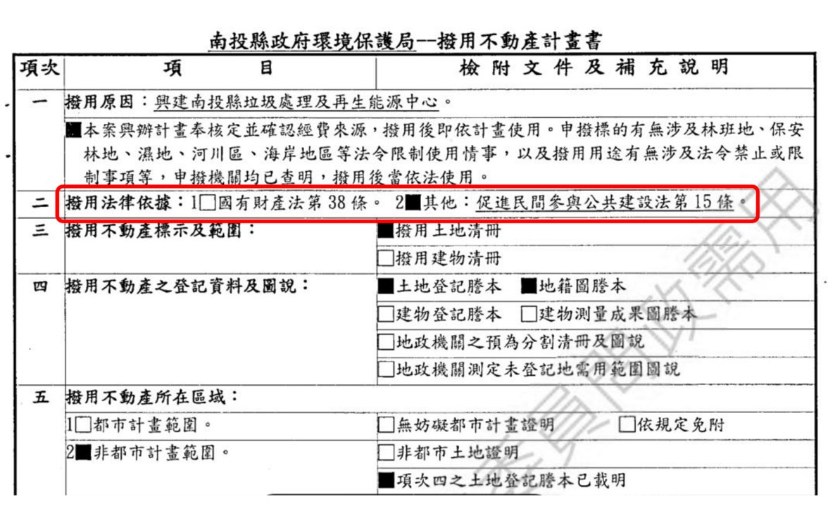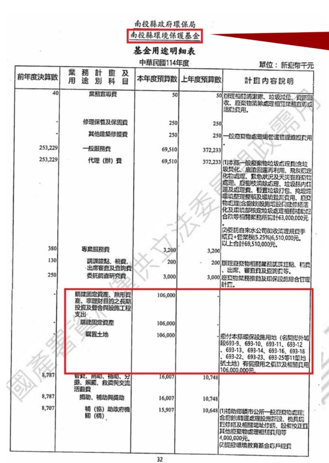 針對撥用基金購置土地的違法疑慮,《上下游》致電南投縣環保局,副局長林隆儒回應,購置土地屬於廢棄物處理設施興建的基礎或延伸,依據《南投縣環境保護基金收支保管及運用辦法》,即使法條沒有明定購置土地,「土地(購置)就可以涵括在其他的事項。」而基金可以編列的會計科目中,本就有購置固定資產的科目。