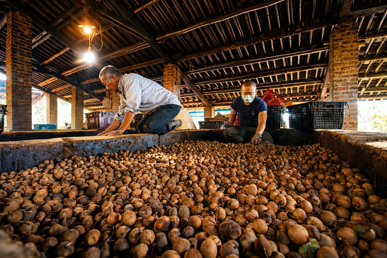 農民在山壁間挖坑,分上下兩層,中間隔了3公尺之遠,下層燒龍眼木,上層鋪滿龍眼,耗時六天五夜慢火燻焙;只要站在上方幾分鐘,就會被煙燻到流汗、流淚。但這份辛苦,會將龍眼的甜轉化成淡雅的甘味,加上柴燻韻味,這項獨特技巧成為地方重要的百年產業與記憶。