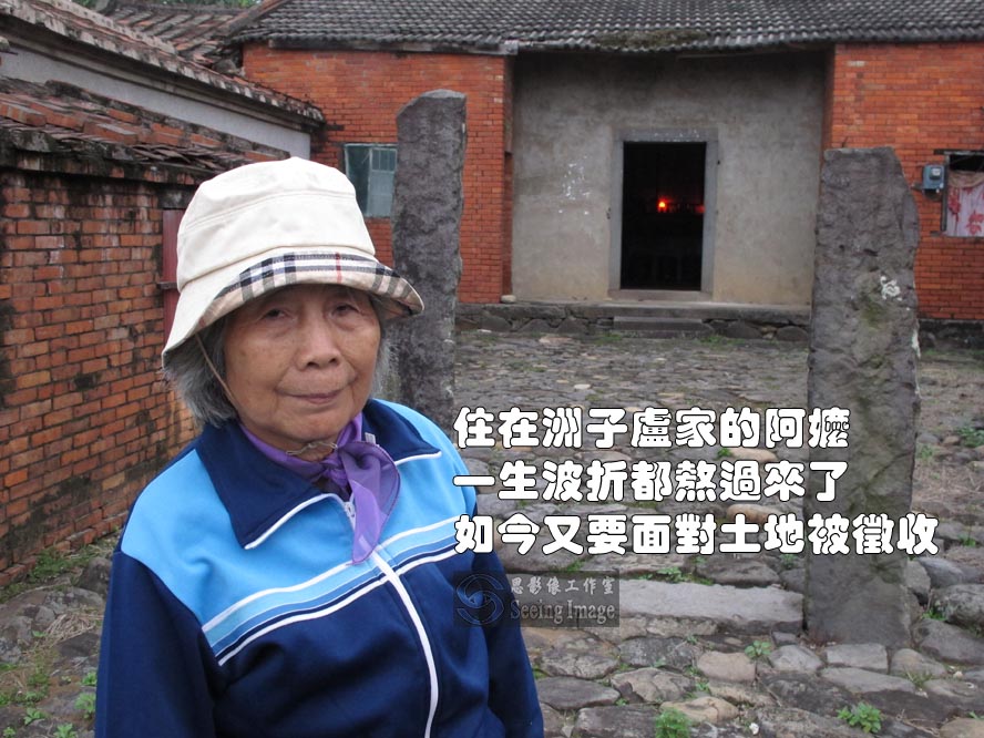 她又說:雖然這裡現在只剩三戶有人住,但是上百個盧家子孫枝散各處,一到過年,子孫滿堂。回想以前種稻的時候,一大家子一起幫忙農作,熱鬧得很。也因為子孫眾多,所有田產都是共有,有一部分已經賣給財團,婆婆和她兒子也擔心,如果沒有徵收,財團會不會也是要來搶他們的地?我安慰她:持分的事也可以靠土地重劃去解決,不是一定要徵收才能解決問題,只要先留住,所有問題都可以跟政府慢慢談。他們同意我的話,也希望祖厝繼續留著,正廳的祖先永遠安身於此。