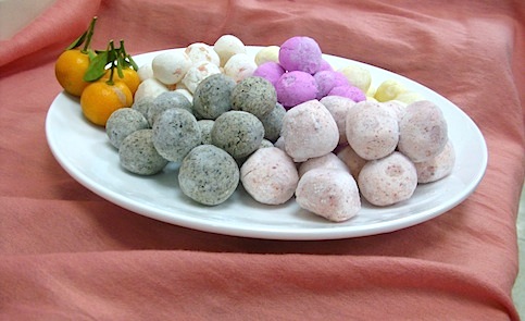 - 將糯米粉與傳統嫩豆腐混合均勻,均分為5等分,分別拌入芝麻粉、紅龍果、百香果、葡萄柚搓揉成多種口味的粉團之後,再揉成小湯圓約8公克待用。