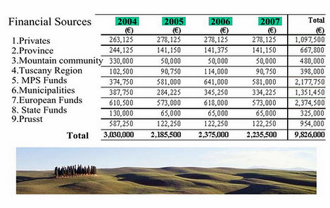 幾年之中,財政逐年編列經費共達9,826,000歐元[註11],來源大部分是私人捐贈、地方政府、地方社群、西耶納地方銀行、歐盟…,而義大利中央政府支援的比例則非常低(圖10),十足顯示這是一個發展自地方政府與居民主動意識下的行動。