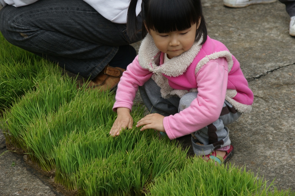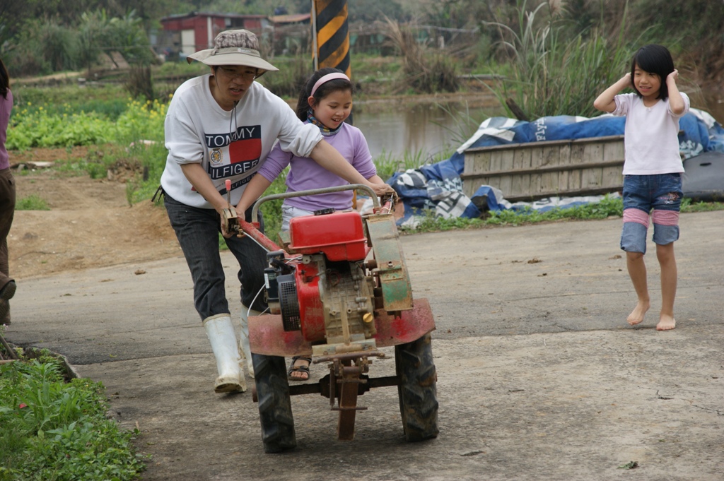 另外,駿富大哥也讓大家體驗小耕耘機。當天同時也有插秧機在插秧,插秧機的速度很快,一下子一片地就插好秧了。
