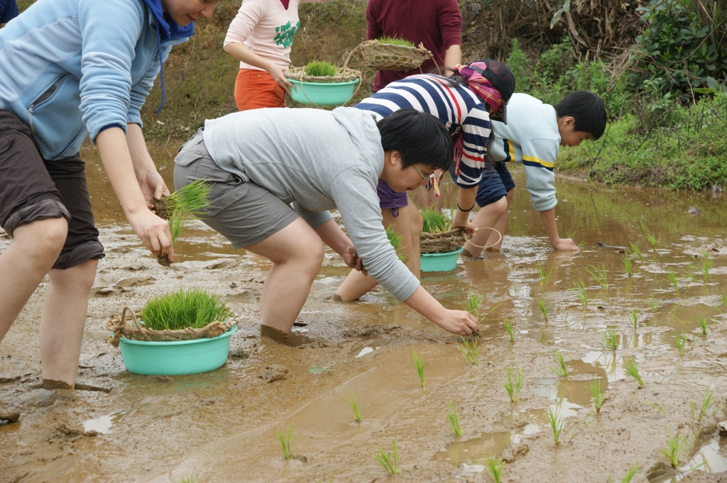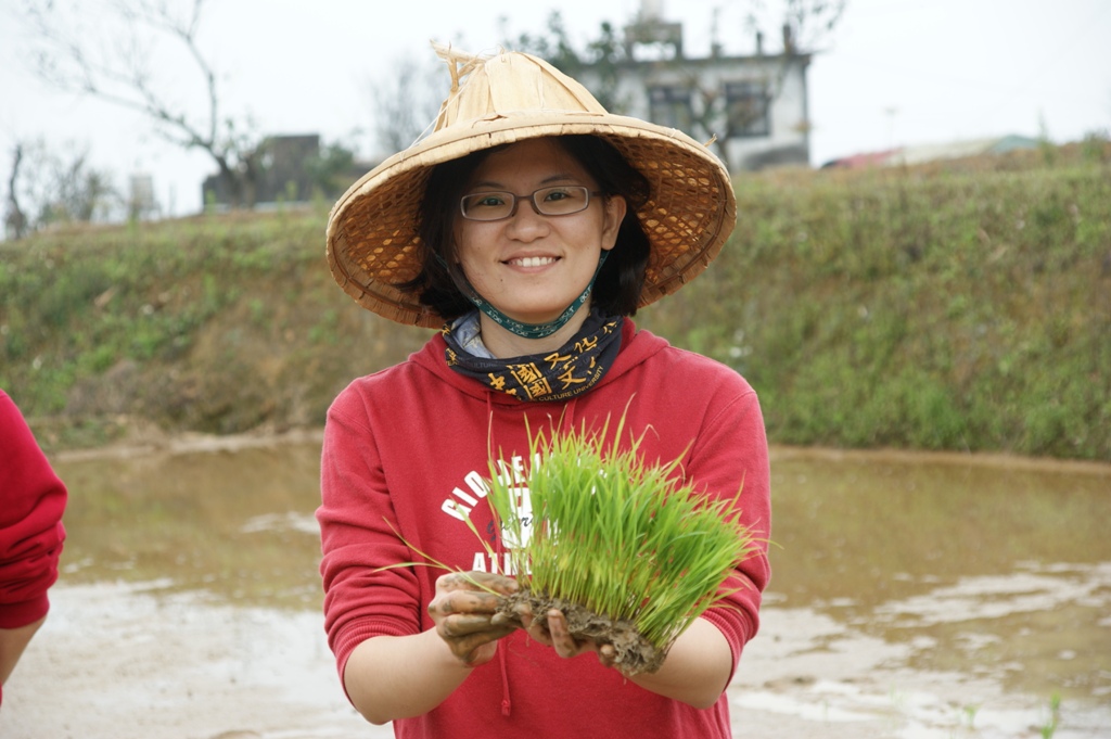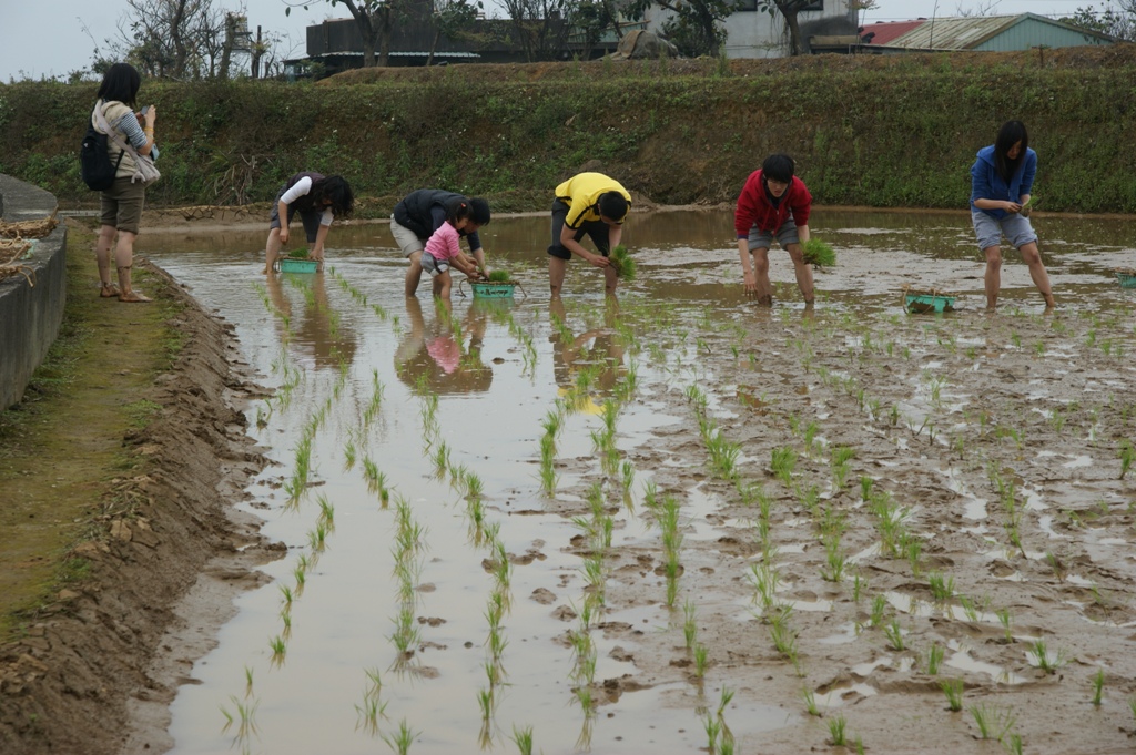 大家紛紛換裝或將褲管捲起準備下田,淑珍的叔公先示範實際插秧,他先插第一排,讓我們對齊他的秧苗。大家已經迫不及待要下田感受了,腳一踏下去,濕軟的泥土馬上讓腳陷下去,所幸今天不是很冷,不然腳就要凍著了。