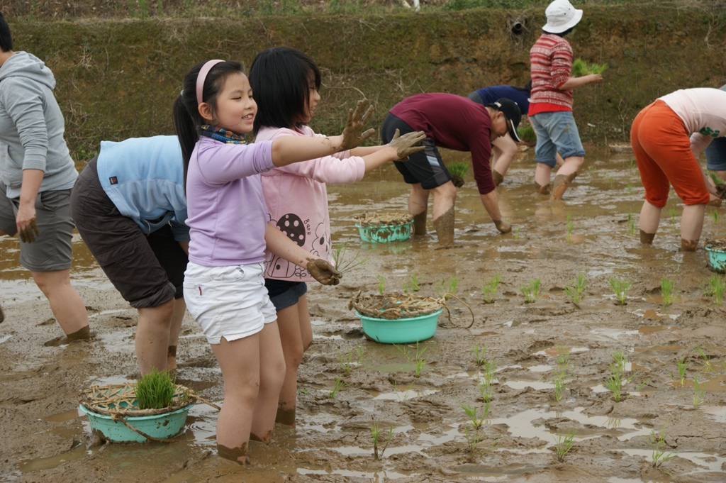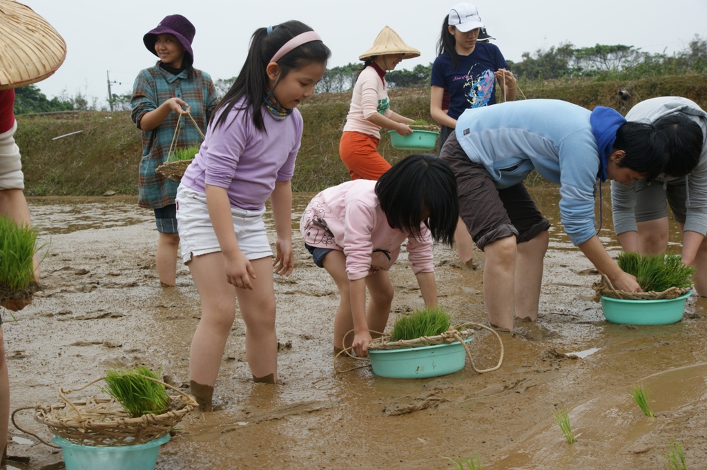 大家很認真地動手插秧,感受彎腰下田的辛苦,不過玩得開心就好,因為實在插得很醜,一望去彎彎曲曲的秧苗,有些地方還空著,有些則太密集,大家身上也沾滿泥土,但是實際回到泥土地,感受還是很快樂的,赤腳比穿鞋舒服多了,小朋友更是開心,喊著要把所有秧苗插完。