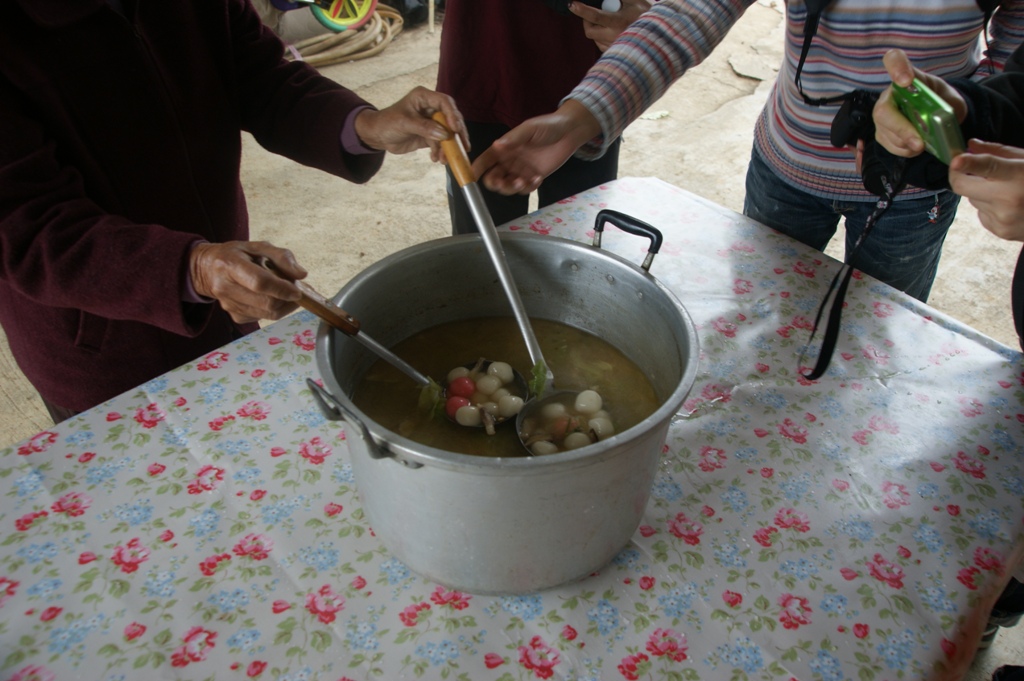 大夥插完秧後,雖然沒有非常累,但也舒展了筋骨,肚子又覺得有點餓了,真的種田勞動很容易餓,淑珍的媽媽已經準備好了鹹湯圓,聽淑珍說以前插完秧都要吃湯圓,所以昨天他們就搓好湯圓,煮好的湯圓香氣四溢,讓人食指大動,而且這時天才下起毛毛雨,真是太幸運了,駿富跟大家分享插秧的心得,可是大家已經心在湯圓上了,結束分享後就一擁而上,馬上把一鍋湯圓吃光。
