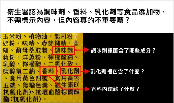 現行<食管法>雖規範,廠商必須寫出各種添加物的化學名稱。但衛生署卻在<食管法施行細則>規定:「屬調味劑(不含甜味劑、咖啡因)、乳化劑、膨脹劑、酵素、豆腐用凝固劑、光澤劑者,得以用途名稱標示之;屬香料者,得以香料標示之;屬天然香料者,得以天然香料標示之。」