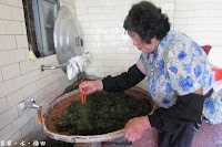 三人巡了一回,新芽幾已被我們收入袋中,盧伯喊收工,準備下山製茶去了。回到盧伯家,盧嬸已準備好,讓我們把茶菁倒出來在日光下進行萎凋,採茶製茶需要一鼓作氣,這也是為何採茶最好在好天時進行的原因。吃過午餐,就要弄茶(lāng-tê)了,J和我依著盧嬸的指示,反覆播弄茶葉,接著盧嬸起大灶,開始炒茶,然後交給盧伯揉茶,最後再交回給盧嬸焙茶。不同階段,飄散出不同層次的茶香,那過程好讓人回味。