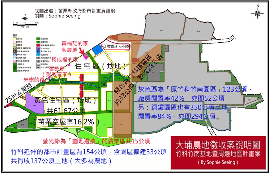 再進一步說,大埔事件根本不是四戶能不能拆的問題,而是整個竹南科學園區以及都市計畫區有無開發必要性的問題!那些已經開發的土地,房子不一定要蓋、廠房不一定要有,光是整地、公共建設、買空賣空,就有多少人獲利了!而這些利益又有多少是建立在毀滅別人的家園之上!一個看不到必要性、公益性(沒有必要就不會有公益!)的開發案,卻又要強取豪奪人民的財產,中央政府與地方政府狼狽為奸,視人民居住權、財產權、生命權於無物,如果今天我們可以容許這種事發生,那同樣的事情是否哪天也可以發生在自己身上?台灣人民,難道你還感覺不到我們國家所面臨的危機嗎?