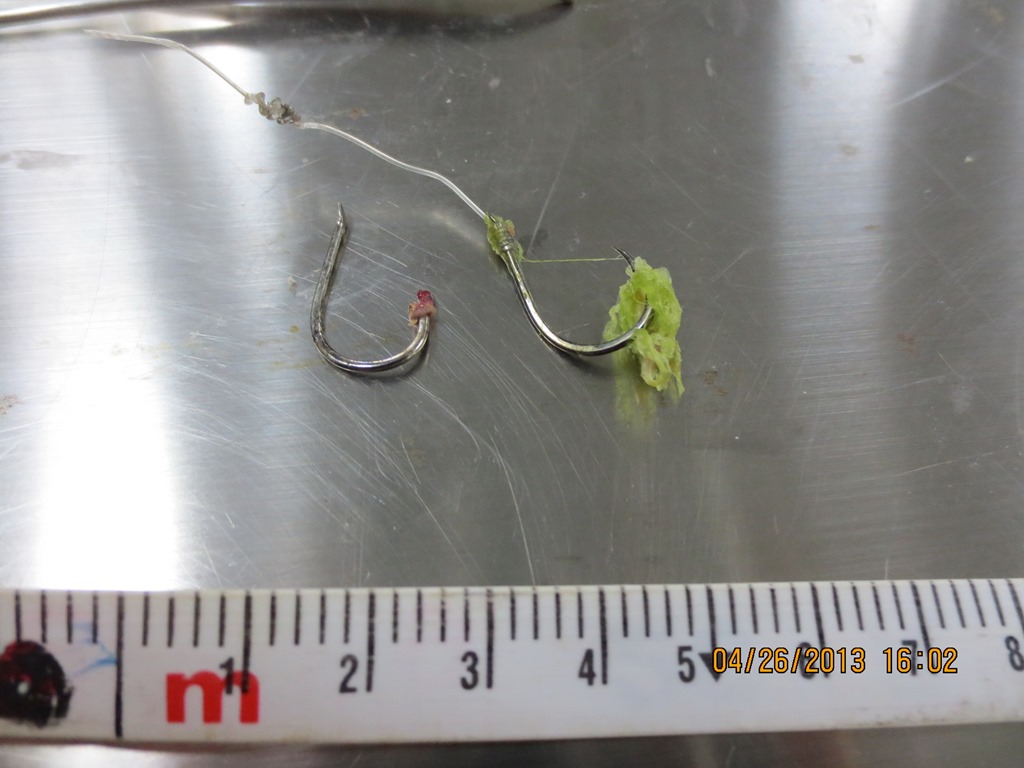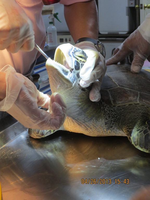 此外,4月份收容一隻來自台東的綠蠵龜,是由海巡署東部地區巡防局81岸巡大隊,通報海生館及台東縣政府。海巡人員表示,該海龜被發現時,嘴邊可看到魚線。經台東縣政府人員將海龜送去進行X光檢查,將結果轉知海生館獸醫師,獸醫師判定確實有魚鉤卡在食道,須立即取出。