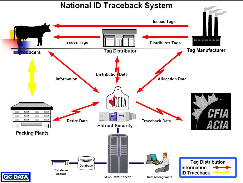 這些牛隻編號與資料經過讀取後,會送到CCIA電腦資料庫中儲存。牛隻進入屠宰場之前如果沒有耳標,將禁止屠宰。牛隻經屠宰分切後,也可以根據肉品包裝條碼,追蹤到原屠宰牛隻的條碼資料,也就是說,一頭牛從出生、屠宰一直到市場,所有資料都可以被追溯。