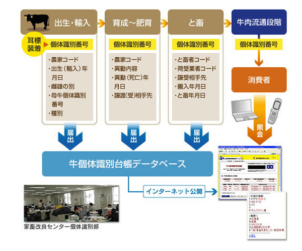 透過這套牛隻的產銷履歷資料,消費者從產地到餐桌,對於盤中這塊牛肉的來源與生產過程,一清二楚。消費者只要根據產品包裝上的牛籍個體識別號碼,進入「獨立行政法人家畜改良中心」網站即可查詢牛肉的產銷履歷。