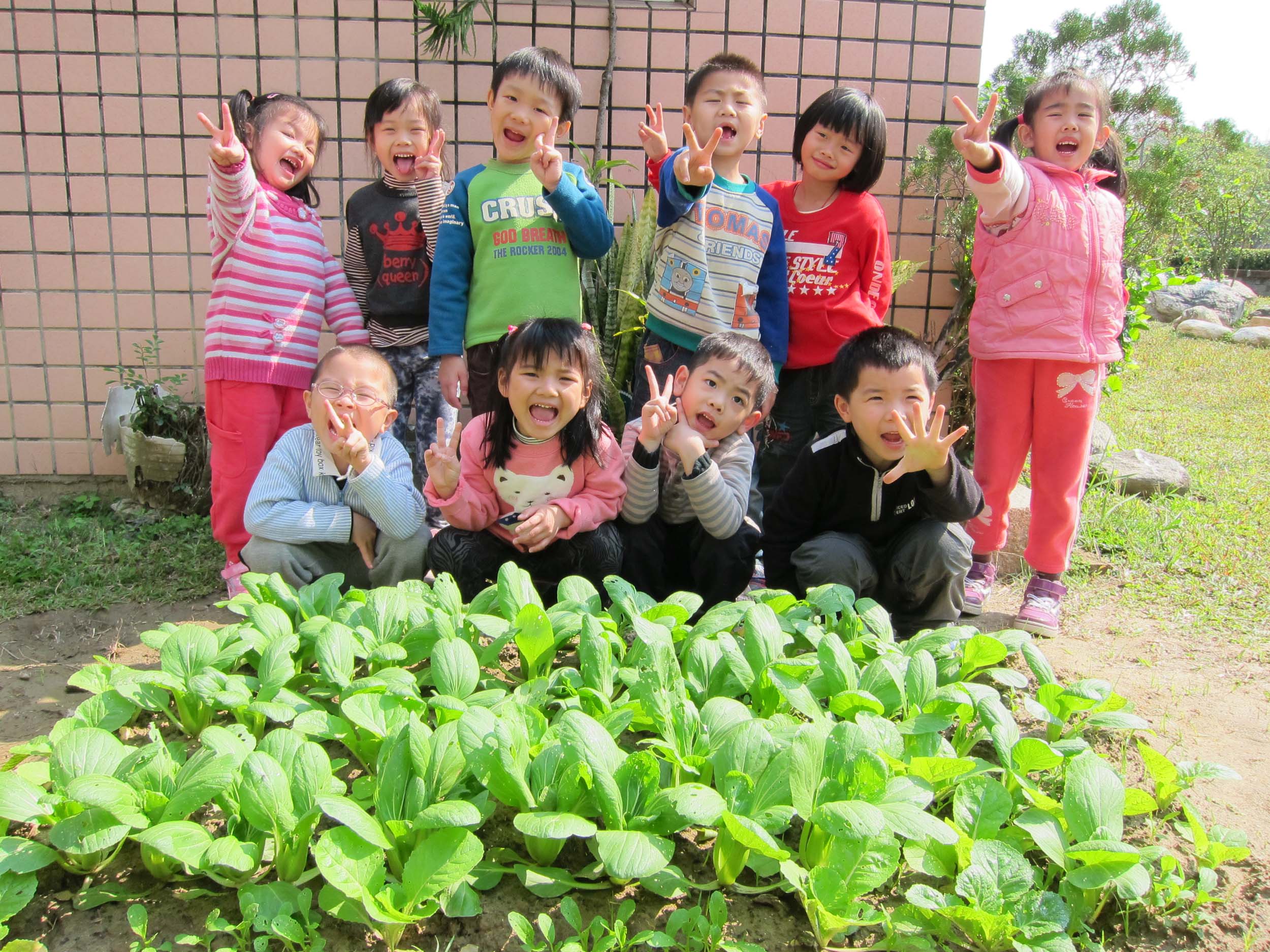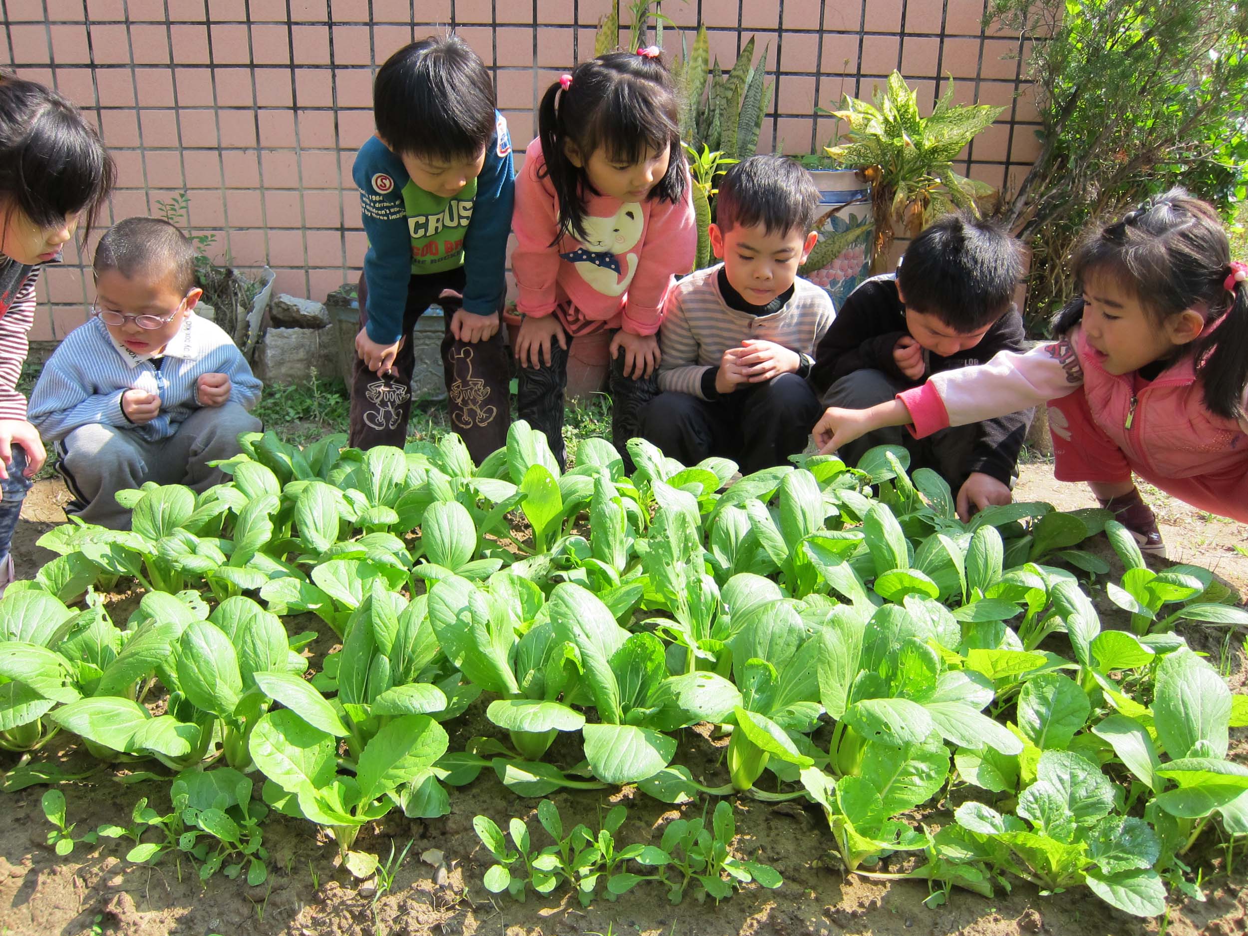 整畦完成後就開始引導植栽菜苗,為符合時節,老師自父親的菜園篩選取了清江菜、大陸妹菜的幼苗到學校,幼兒在田壟上以手掌丈量間隔並整齊的挖洞植入菜苗,然後再以雙手覆土。起初,有些觸覺敏感的幼兒並不願意掌指沾泥,後來在鼓勵下,孩子開始呼嚷著: 『老師,我在幫泥土搔癢』。小小農夫揮汗後,看著貼著泥面的菜苗,興奮得瞇眼合掌許願:『希望全部小菜都快快長大』。