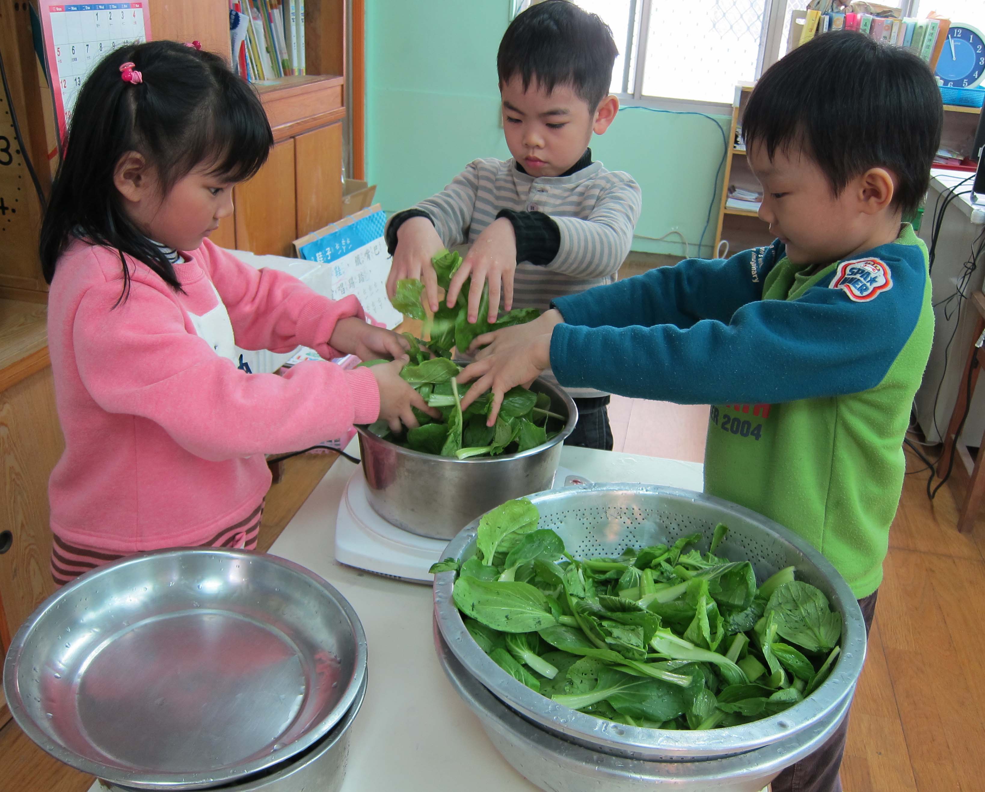 經過半個月至一個月,我們的蔬菜陸續收成了,孩子們決定清江菜和空心菜要自己清洗、烹調,作為午餐享用,在清洗清江菜的時候,還不時傳來小孩大嚷著:『老師我洗到一隻蟲了,牠在游泳』,孩子懷著童真的愛心把菜蟲抓起放回泥地:『蟲蟲,回去找你的媽媽吧!』在他們的眼神中閃著尊重生命的情懷。