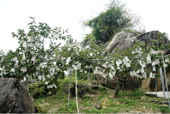 六、七、八月,則是套袋時節,會看到滿山遍野都是白白的套袋,其目的是為了要防止病蟲害,主要是果蠅,其問題很嚴重,所以才要套袋,果蠅是外來種,多年前有人從國外進口木材,夾雜在裡面帶進來的,農友表示十多年前哪裡需要套袋,但套袋也是各家農友展現本領的時刻,因為套袋是以袋數來算工資,套越多賺越多,很有本領的人甚至一天數千袋都有可能,收入也是數千元,這對於務農人家來說,是一筆很高的收入。所以這段時間,農人們都搶著做套袋工作。