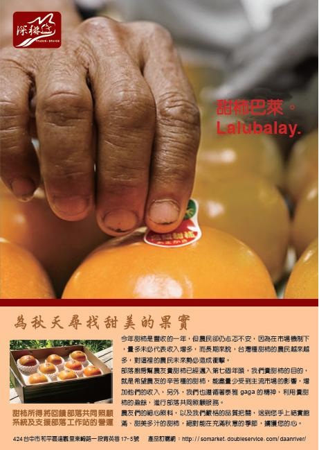 不過今年也有讓人振奮的事情,因著拍攝「賽德克.巴萊」而走紅的林慶台(飾演中年莫那魯道)來協助部落廚房甜柿產銷代言,對於發展社區產業努力要打出知名度的部落廚房而言,有所幫助。