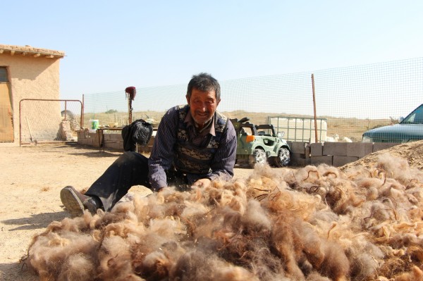 (在牧民生活文化中,一頭駱駝全身上下都是資源。達來爺爺正在將駱駝毛加工,準備製成繩子與禦寒棉被等生活必需品。拍攝/林吉洋。)