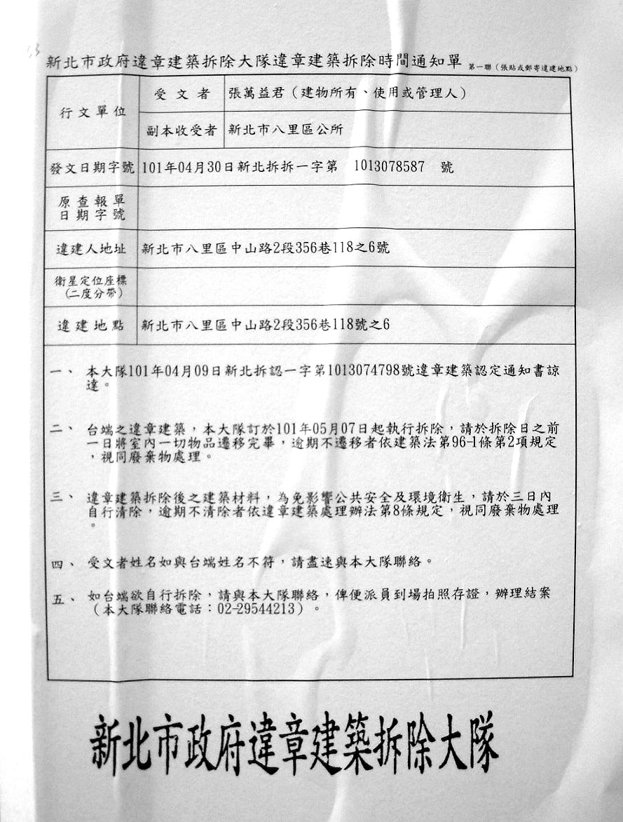 八里有個緊急事件,台北港特定區土地徵收地主之一的張萬益先生他們家,因為不同意被徵收,而兩層樓的房子從蓋好到現在,一直被刁難拿不到使用執照(但是有建照),現在被新北市政府說是違建,5月1日張貼公文在張家後門,5月7日就要來拆了,張家堅持原地保留以維持原本就做園藝的生計,他們需要大家的協助~~