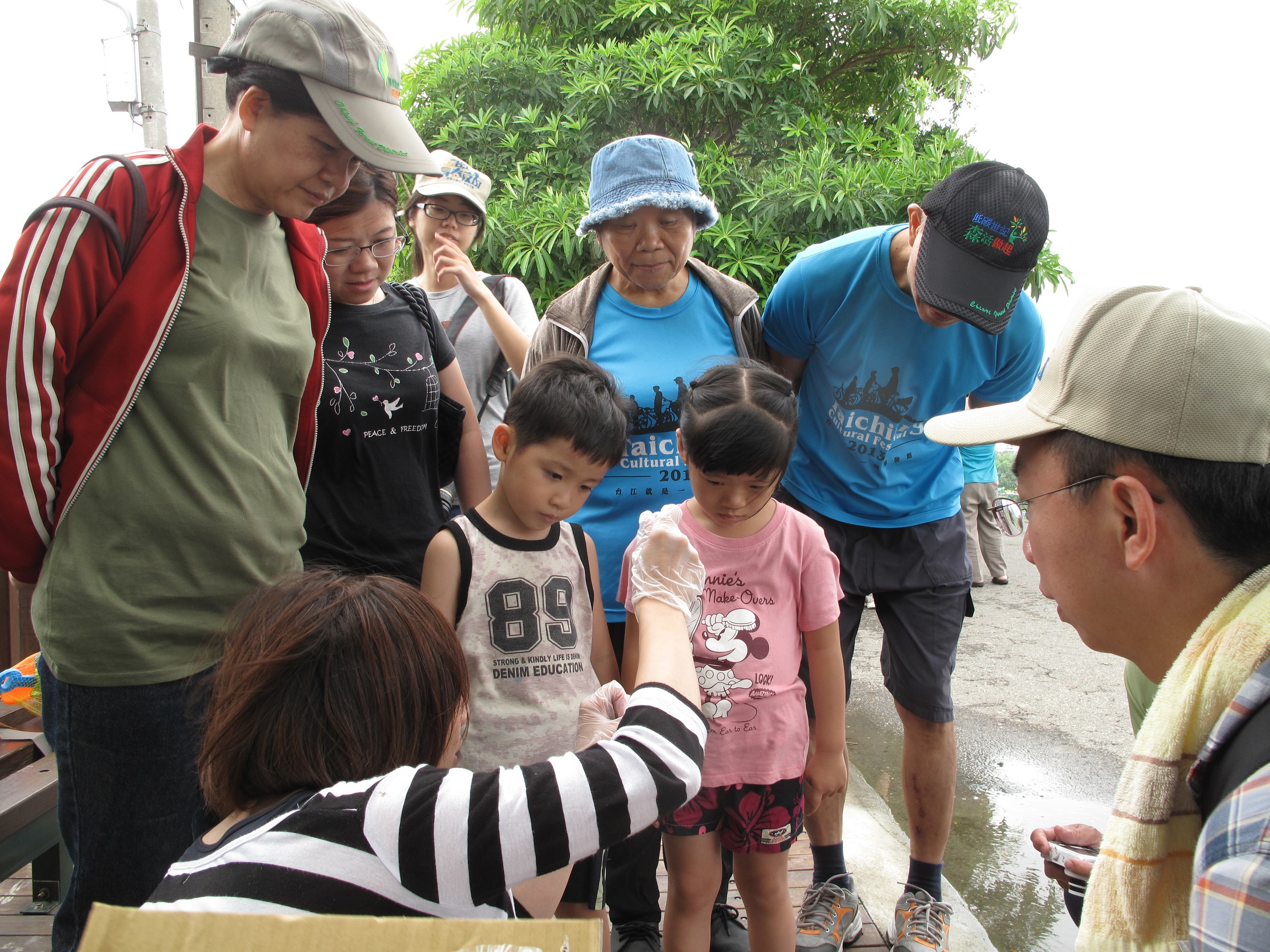 莊孟憲是台南社大環境學程的召集人,這一天中午,他負責帶領大家到高灘地上認識土泥,教大家用簡易目測底泥土質的辨識方法。他身旁兩個十歲上下的寶貝兒子則充當助教,踩著雨鞋拎著水桶,熟門熟路地在紅樹林灘地裡面鑽進鑽出,忙著幫老爸找出各種台江的本土招潮蟹。