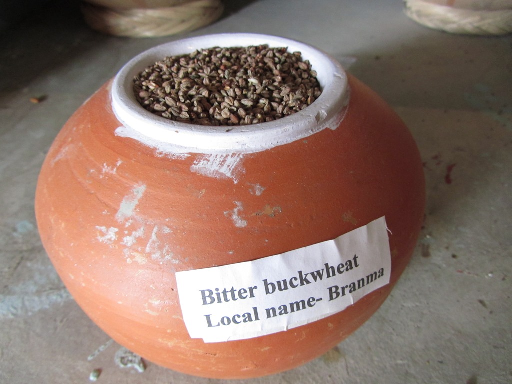除了積極推動有機認證外,不丹政府對種源保育也有積極作為,在研討會期間,我參觀了設於Bumthang社區裡的種籽銀行和在地食物推廣中心,這是一座合院式的建築,裡面販賣不丹原生穀──喬麥(buckwheat)做成的食物,並設置種籽保存室,保存在地種源。