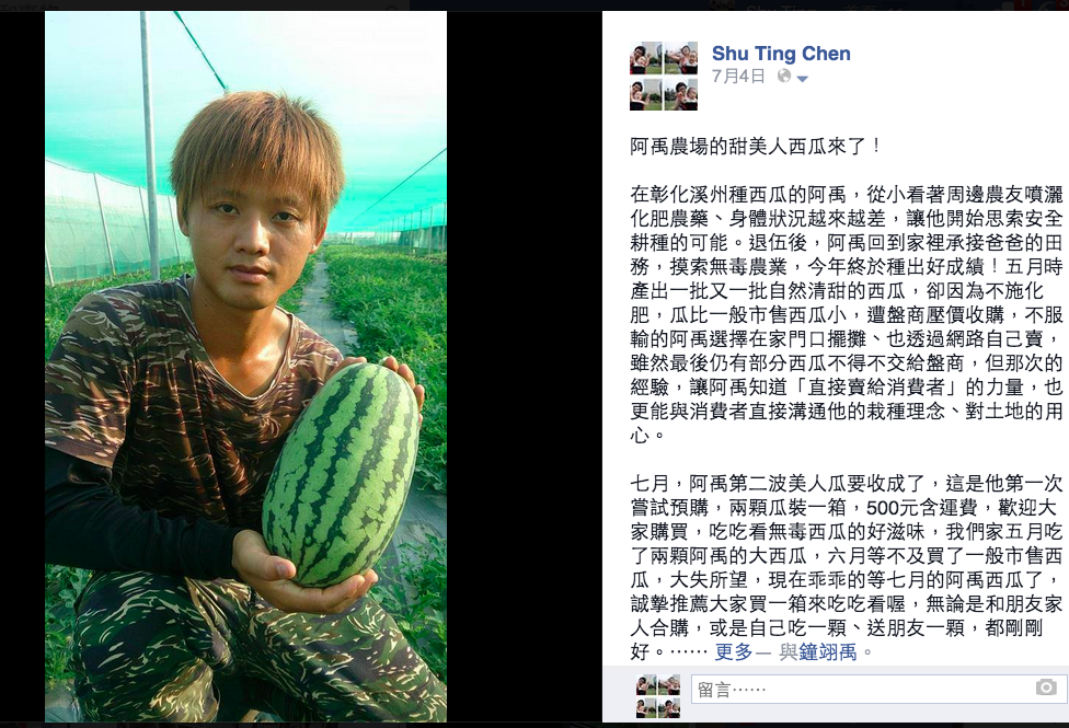 另一個例子是溪州無毒西瓜的阿禹,起初他只在FB轉貼了自己的報導後,放了這樣的三句話。我一看,心想,幫他轉文章的人只會轉走新聞,不會轉走他的資訊,就算記得複製貼上,他在農地忙,一定會被電話煩死。