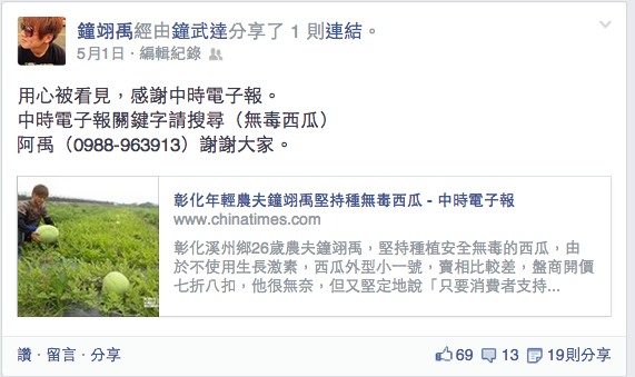 另一個例子是溪州無毒西瓜的阿禹,起初他只在FB轉貼了自己的報導後,放了這樣的三句話。我一看,心想,幫他轉文章的人只會轉走新聞,不會轉走他的資訊,就算記得複製貼上,他在農地忙,一定會被電話煩死。