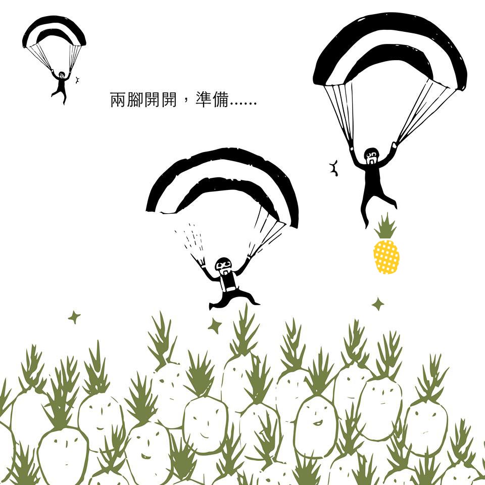 地上的人們開始大叫『哇!』,還有熱情的鄉親大聲吶喊著『加油!』,聲音之大,以為真的可以傳到幾百公尺的高空甚至直達天堂,底下的人熱鬧滾滾,上面的人卻是腸胃翻滾,默念著跳傘口訣