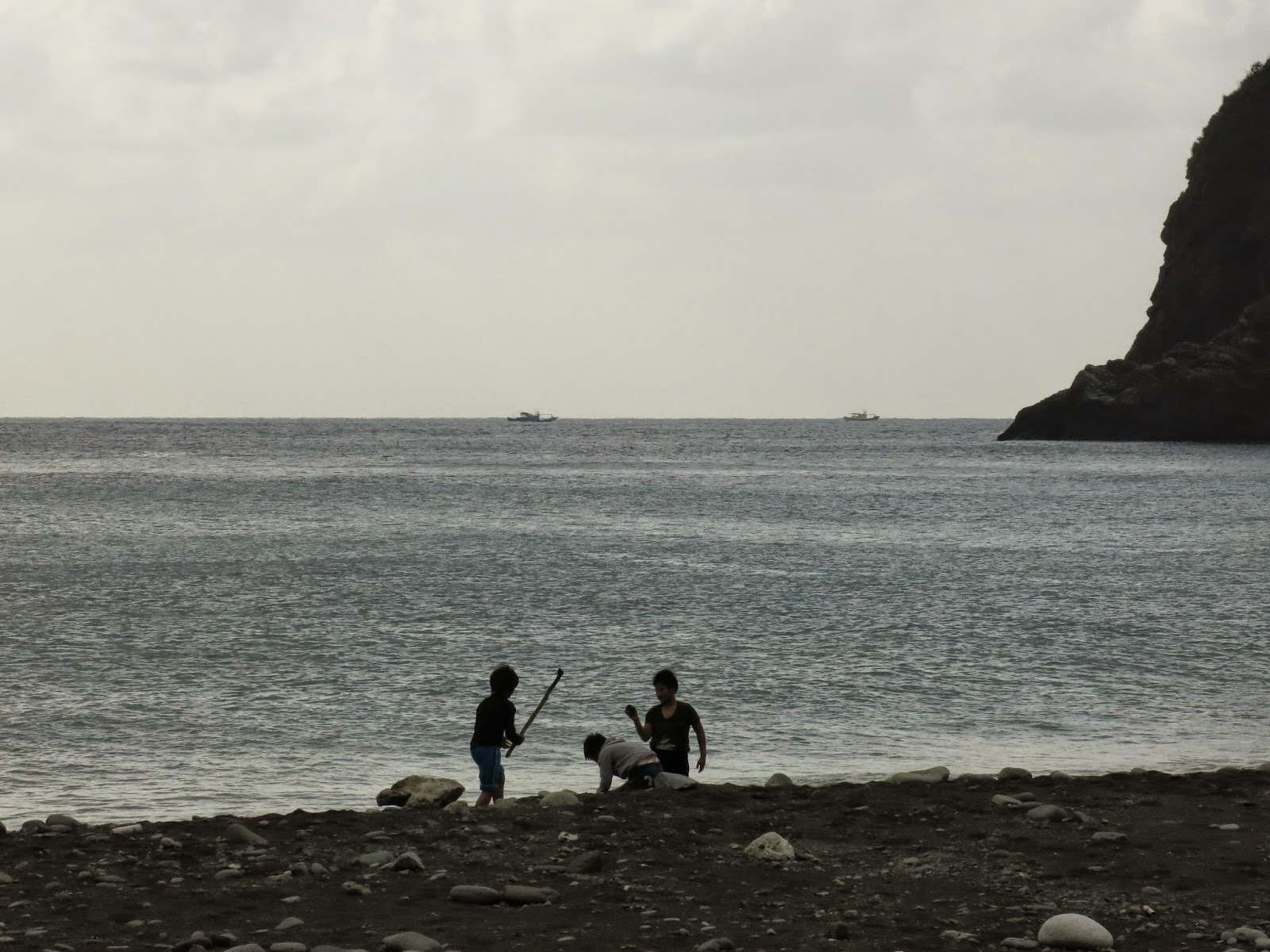 傍晚時分,3個孩子在海邊玩樂,口裡喊著一聲聲:核廢惡靈,滾出蘭嶼。攝影/何怡君