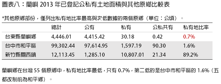 蘭嶼鄉朗島國小校長胡龍雄曾在原住民電視台《部落大小聲》「台東區域計劃該如何規劃?」現場節目中(下稱「原民台節目」)說明:「蘭嶼人在處理土地的時候,認為私有地本來就是我的,我不需要跟國家承租這塊地,所以大部份的蘭嶼人並沒有為他的房屋、宅第申請承租(編按:因土地權屬為國有地,達悟族人必須承租10年後,才能取得土地所有權)。」圖表八顯示,蘭嶼已登記私有地之比率連全部已登記土地的百分之一都不到。