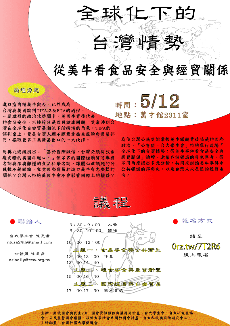 為了使台灣公民更能掌握美牛議題背後隱藏的國際政治,學生與民間團體特別在「五月十二日」於「國立台灣大學法律學院萬才館2311室」舉行這場─ 「全球化下的台灣情勢:從美牛事件看食品安全與經貿關係」論壇。邀集各個領域的專家學者,從不同角度提出多元分析,一同討論美牛事件中公共領域的得與失,以及台灣未來長遠的經貿走向。誠摯邀請您一同參與及討論!