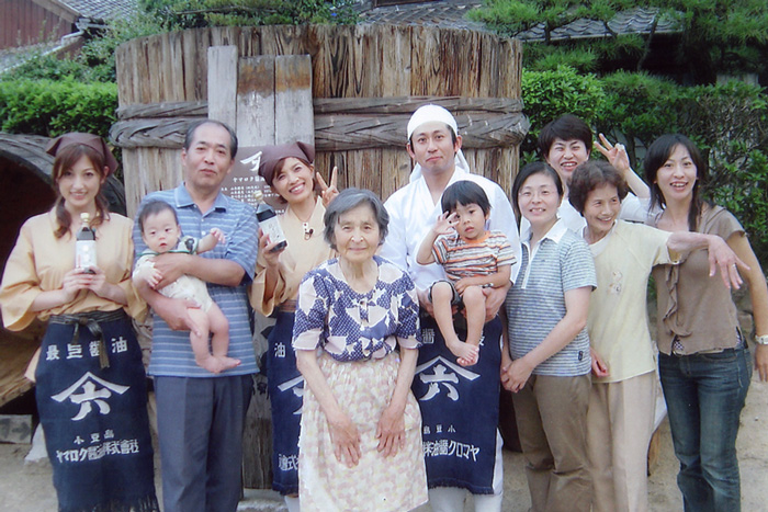 離開釀造場回到入口處,工作人員指著剛回到家的老闆,我們也向老闆點頭打招呼,一看不就是早上在映畫村內店舖的老闆嘛!實在是太巧了,竟然在同一天巧合的拜訪了醬油場的店舖和釀造場。原來店舖裡的老闆是釀造廠第四代的山本健司,目前已交給第五代的山本康夫,最有趣的是他們也在自家的文宣上也介紹了第六代預定的接班人山本康藏(其實還只是個小孩子),不難看出這家人對自家釀造場的傳承心意。
