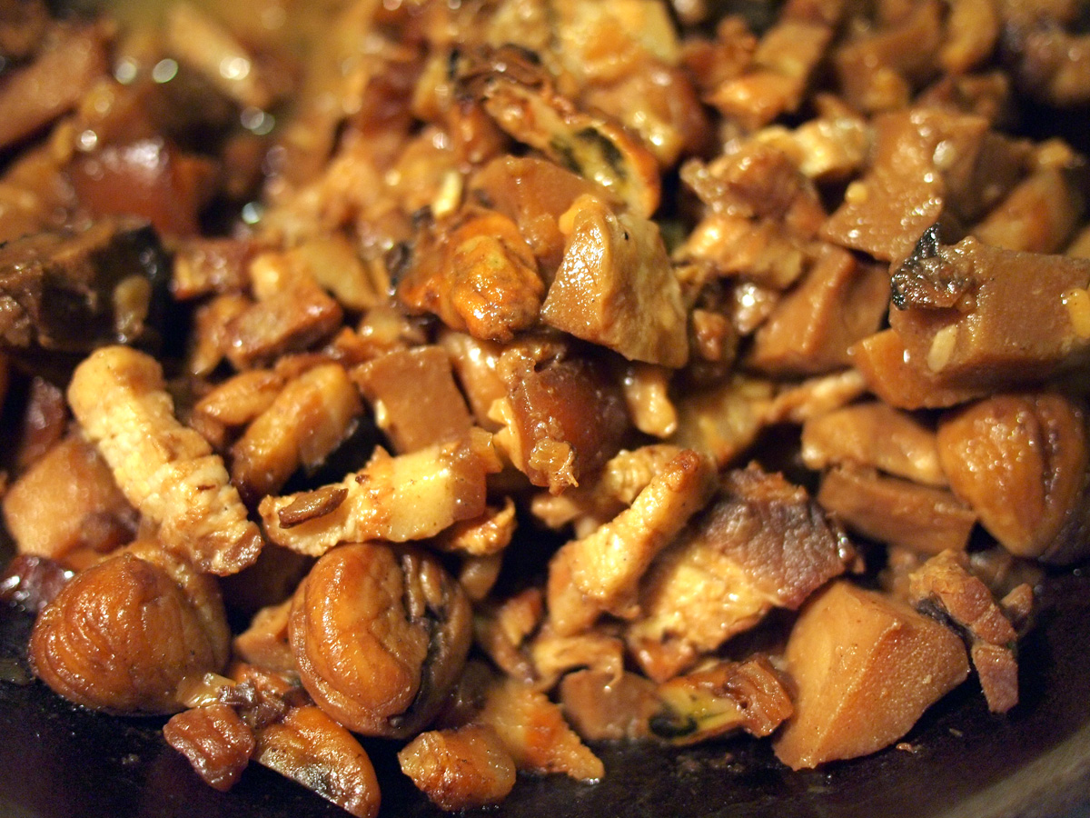8、長糯米泡冷水約2.5到3小時,瀝乾水分,與紅蔥酥、五香粉、白胡椒粉,還有滷汁一起拿來炒米,炒到入味即可,不要太軟,待米冷了即可開始包粽,每個粽子包一塊肉、兩塊筍丁、一顆栗子、兩塊香菇丁,包的時候,粽子的三角要扎實。
