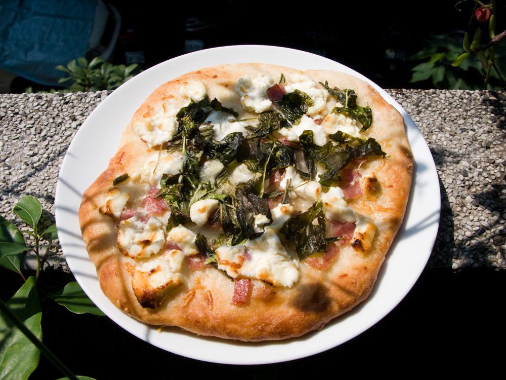 翌晨,起個大早,備料、做麵糰、擀麵皮,說起來一點都不難做,也很容易有成就感。我儘量選用天然有機的食材,吃起來既清爽且沒有心理負擔。而加了芝麻菜與一些鼠尾草的PIZZA,口感略苦,卻有回甘,算是成人口味的披薩,也很快被外子跟我一起祭了五臟廟。不過如果再能有一塊石板來烤披薩,想必效果更加分!