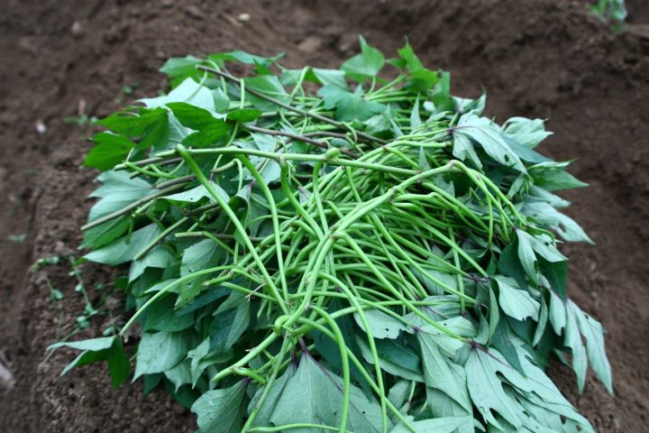 剪下的蕃薯藤。長度約1尺3、1尺4,有幾節目,就會長出幾組地瓜。